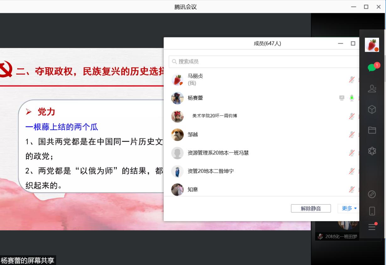 为贯彻落实习近平总书记在党史学习教育动员大会上的重要讲话精神,扎实开展党史学习教育,引导w88win官网广大团员青年了解党的光辉历史、感悟党的初心使命、领会党的创新理论、体认党的精神谱系、传承红色基因,以优异成绩迎接建党100周年,按照《共青团中央关于在全团开展“学党史、强信念、跟党走”学习教育的通知》的工作要求。3月30日,校团委组织团员青年开展主题为“回首百年中共,探索伟大复兴的康庄大道”的(首期)线上团课,并邀请马克思主义学院杨赛蕾老师为全校647名团学干部讲授课程。