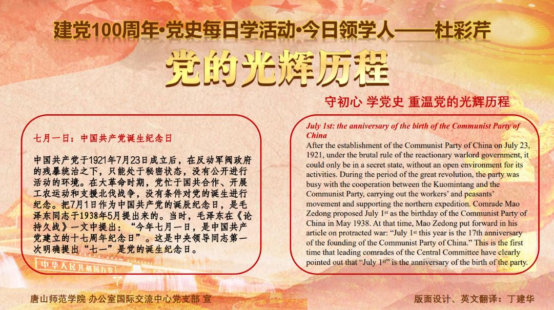 为迎接建党一百周年,响应习近平总书记在中共中央关于开展党史学习教育动员大会上的重要讲话精神,办公室国际交流中心党支部自2021年3月17日起,结合本支部特色,开展“守初心·学党史·重温党的光辉历程”中英文“党史每日学”活动,动员号召支部全体党员踊跃发稿,以党史学习“领学人”的身份在支部内进行党史知识的宣传普及。