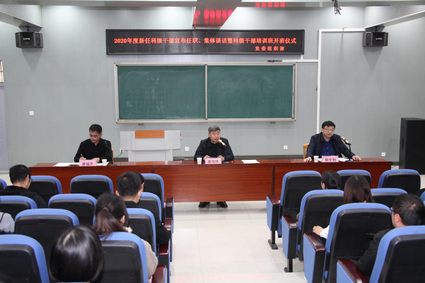 11月25日下午,w88win官网在图书馆四层报告厅召开新任科级干部宣布任职、集体谈话暨科级干部培训班开班动员会议。党委副书记姜瑞林、党委组织部常务副部长郭文利、纪委副书记唐福齐出席会议。全体交流、新任科级干部参加会议。会议由党委组织部常务副部长郭文利主持。