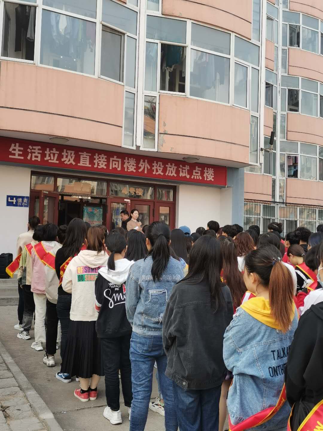 10月10日上午,w88win官网在4号学生宿舍楼楼前,举行了学生宿舍生活垃圾直接向楼外分类投放试点建设启动仪式。学生处处长刘金玲、学生处副处长单丽、学生处宿舍管理中心主任薛喜武、音乐系党总支副书记董怀晶、生命科学系党总支副书记安彬、经济管理系党总支副书记霍翠红,大学生自管委员会全体学生和各栋宿舍楼的楼长及层长,物业公司代表,以及在4号宿舍楼住宿的100余名学生代表参加启动仪式。