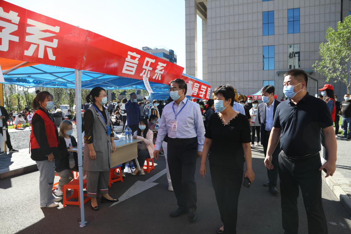 9月16日,w88win官网2020级新生报到第一天,党委书记王英、校长杜彩芹、副校长李子林、安文忠深入迎新现场检查迎新工作开展情况。办公室、党委学生工作部等有关部门负责同志陪同。