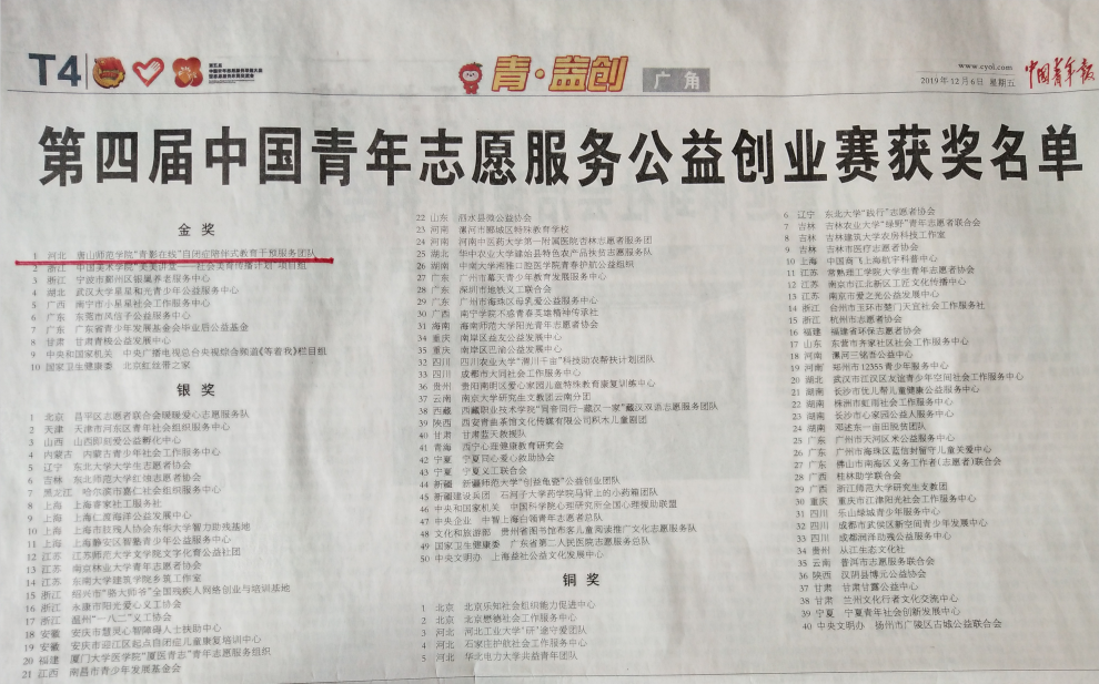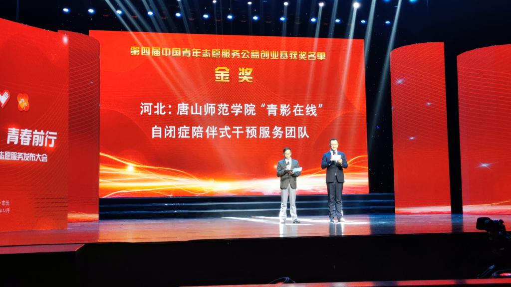 12月2日,由共青团中央、中央文明办、民政部、水利部、文化和旅游部、国家卫健委、中国残联和中共广东省委、广东省人民政府共同举办的2019年志愿服务交流会暨第四届中国青年志愿服务公益创业大赛在广东东莞举行。w88win官网青年志愿服务品牌项目《“青影在线”——自闭症陪伴式教育干预服务》经过激烈的角逐,以全国总成绩排名第一的成绩荣获国赛金奖,也是河北省唯一获得金奖的参赛项目。新华社、中国青年报、中国青年杂志等媒体对大赛盛况及获奖情况进行报道。