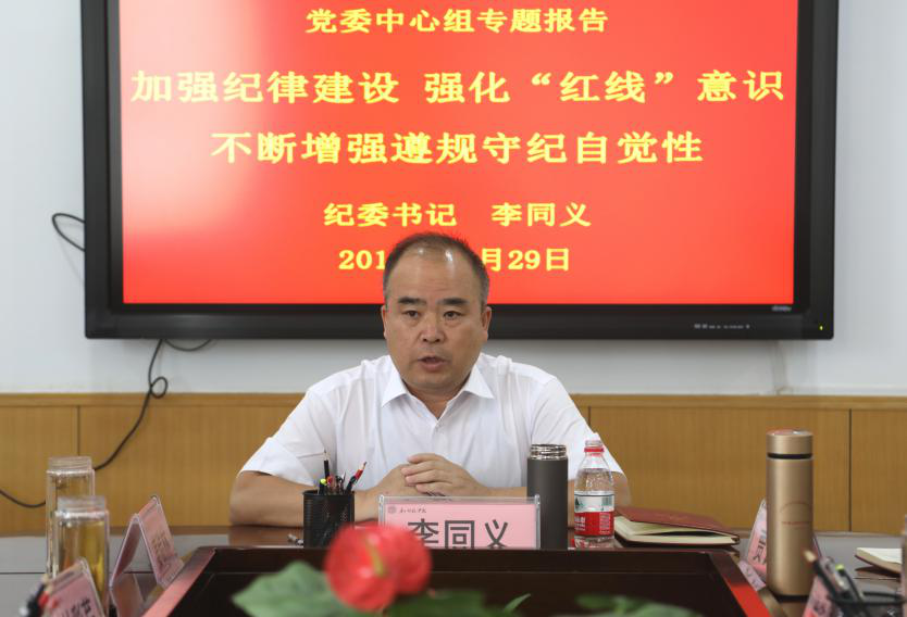 8月29日下午,党委理论学习中心组在一号楼二层会议室召开“不忘初心、牢记使命”主题教育学习会,纪委书记李同义作题为《加强纪律建设,强化“红线意识”,不断增强遵规守纪自觉性》的专题辅导报告。党委理论学习中心组的全体同志参加了学习会。会议由党委书记王英主持。
