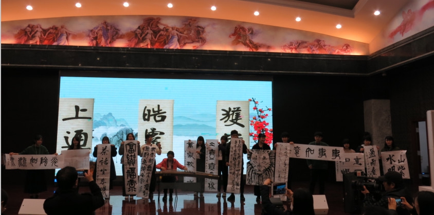 11月7日下午,“书以载道,墨海联谊”中日青少年书法交流大会在冀东书画艺术馆隆重举行。唐山市文联、唐山市文广新局、唐山市社科联、唐山市新联会、唐山盛唐发展总部、w88win体育官网、日本大阪教育大学、中国张裕钊书法研究会、唐山市胥各庄小学的领导和师生代表、广大书法爱好者以及社会各界人士约300人参加了此次活动。唐山市文联副主席罗旭东、盛唐发展总部党群工作部部长薛玉国、w88win体育官网国际交流中心主任李丽娜、唐山市胥各庄小学校长孙士尊、大阪教育大学教授加藤可奈卫、渡边美香、出野文莉、冀东书画艺术馆馆长陈启壮分别致辞。中日两校大学生代表上台发言。冀东书画艺术馆副秘书长党智多主持本次大会。大会现场进行了中日书法家、学生代表的书法展示以及古琴、茶艺等中华传统文化的展示活动。唐山电视台直播50分、腾讯网、网易新闻、长城网对本次活动进行了报道。