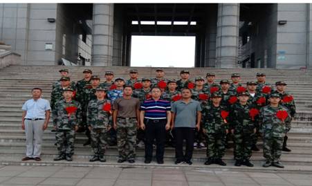 欢送会上,与会领导为光荣入伍的23名学生戴上了红花,并颁发了纪念品,在主楼前合影留念。